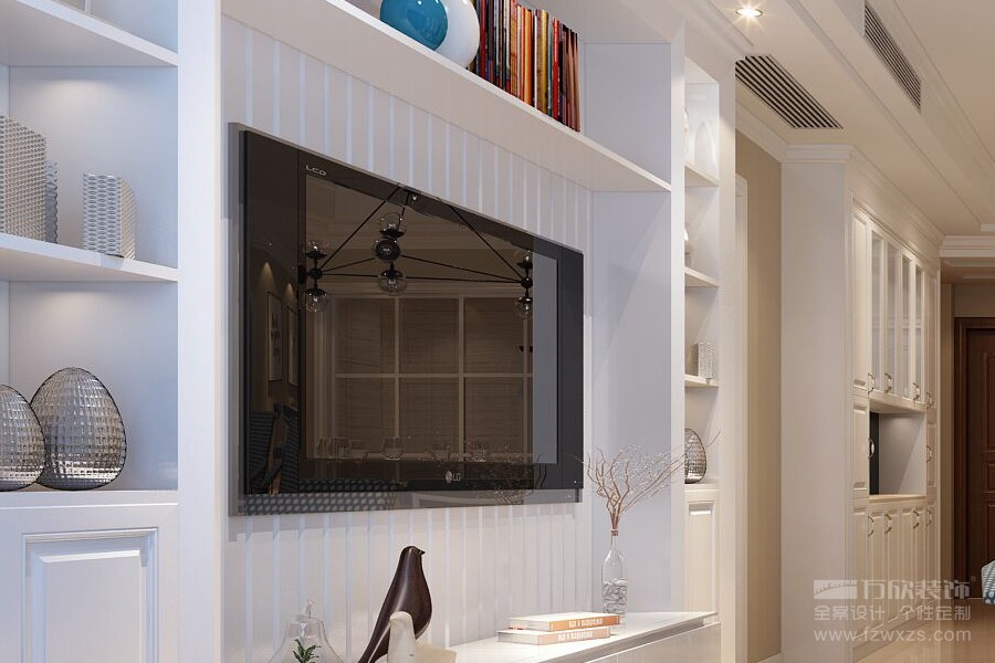 電視背景墻采用一整墻定制的白木柜,屋主收藏的裝飾品被整齊的擺放在壁龕中,不論是精致的擺設(shè)還是看似隨意的點綴,都讓這里散發(fā)著安靜美好的迷人氣息。
