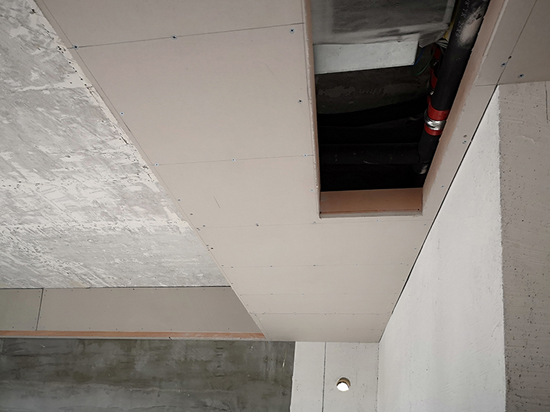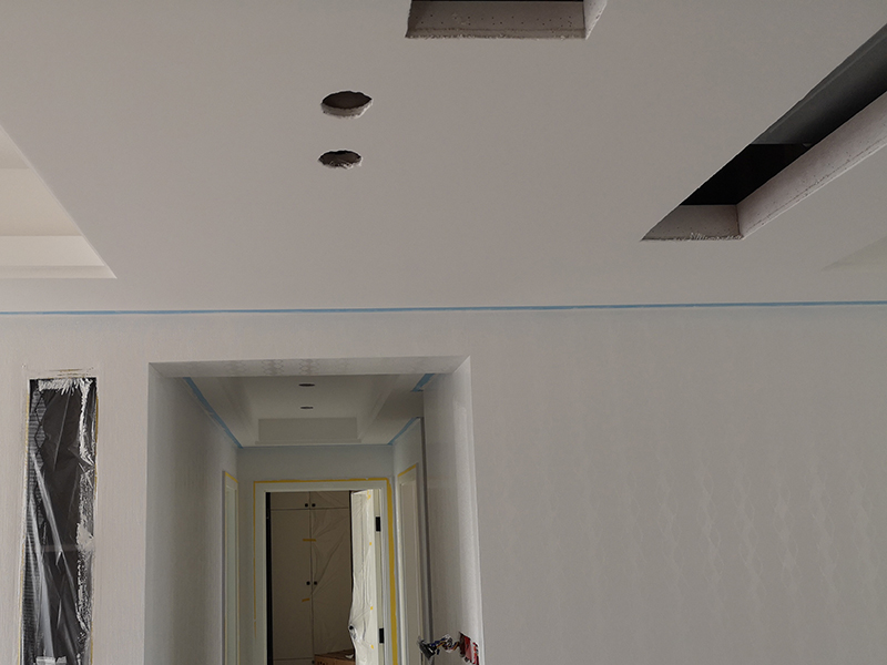 吊頂轉(zhuǎn)角L型整板防裂工藝:在石膏板吊頂轉(zhuǎn)角時采用L型整板工藝,避免在轉(zhuǎn)角處拼縫,防止整板對抗變形而引起板縫間乳膠漆面開裂。