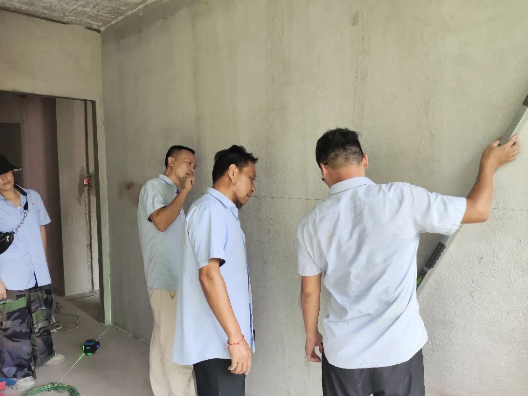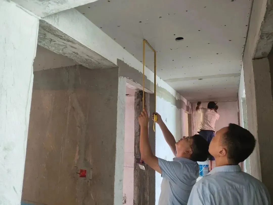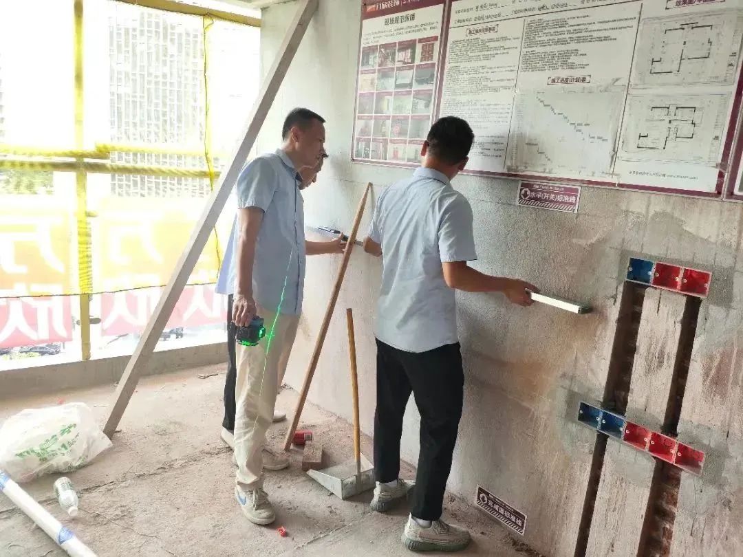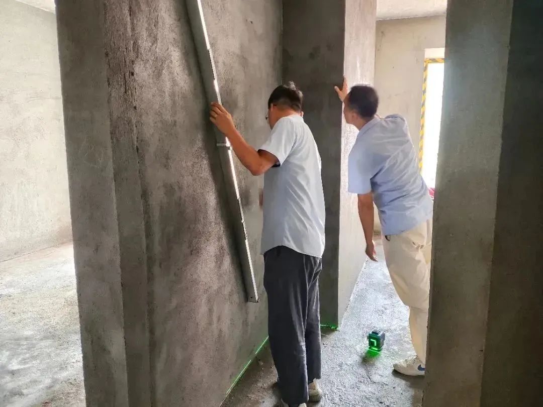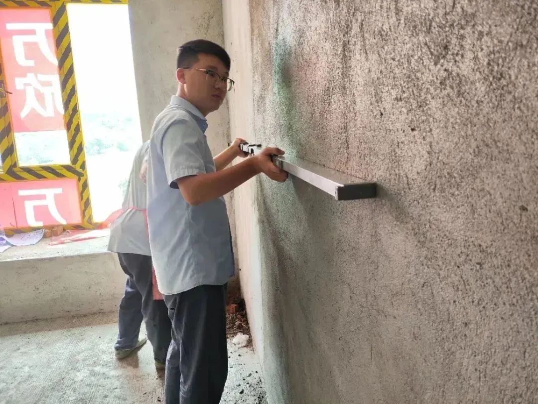 △ 現(xiàn)場(chǎng)用2米長(zhǎng)的靠尺,檢查粉刷后墻面平整與地面是否平整,防止出現(xiàn)空響等問(wèn)題,影響工程質(zhì)量和進(jìn)度。
