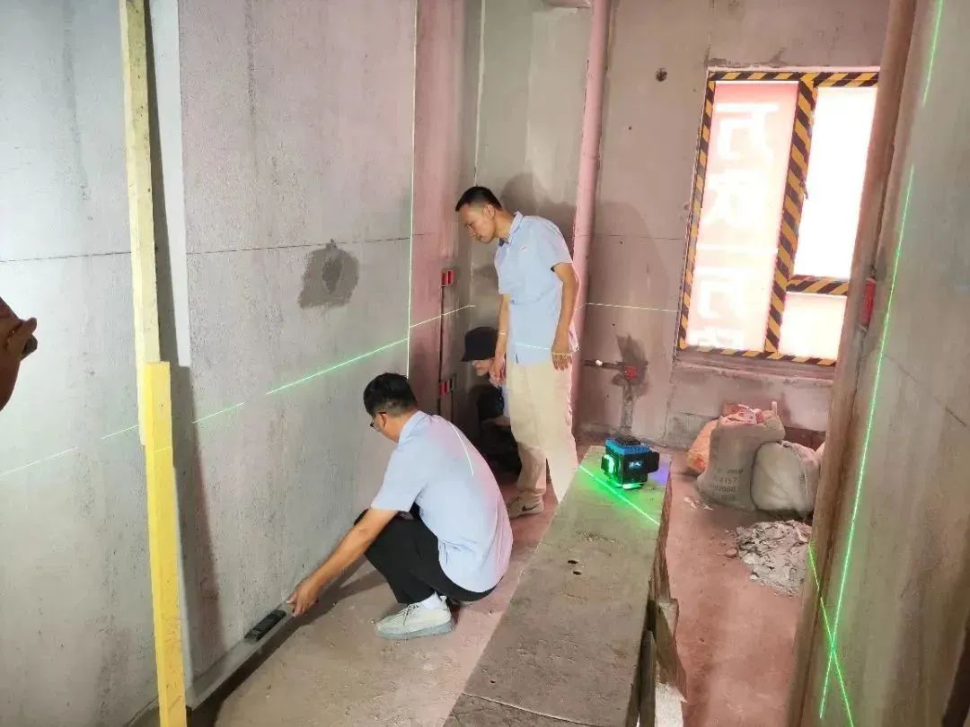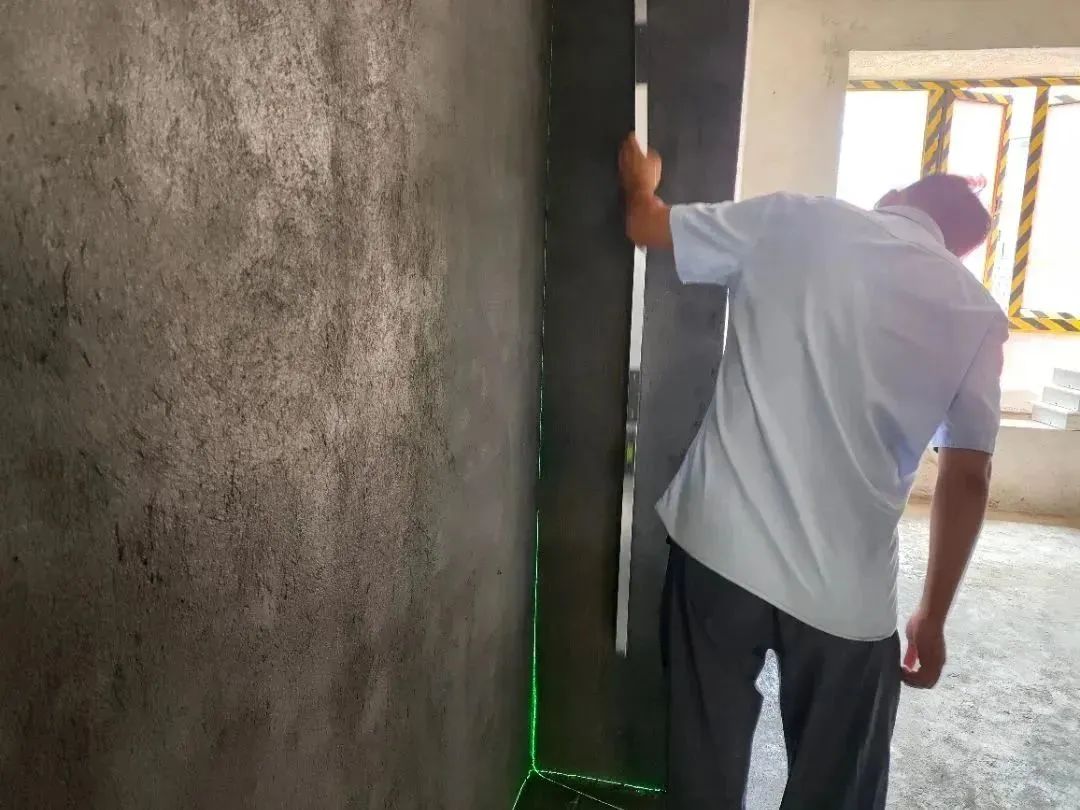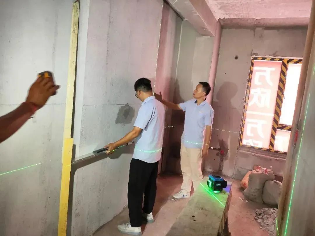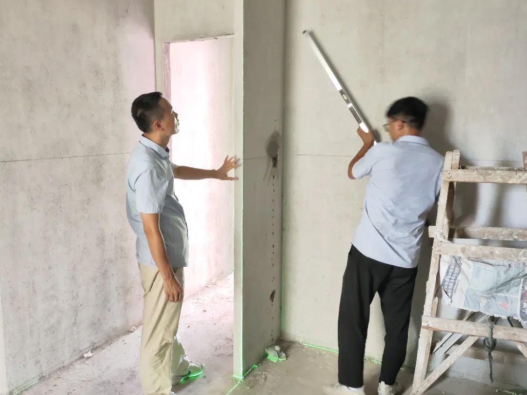 △用兩米靠尺和激光水平儀測(cè)量新砌墻的平整度和垂直度,新砌墻體平整,既能提高墻體粉刷及油漆工藝墻面平整度的效率,還能確保墻體牢固不開(kāi)裂。