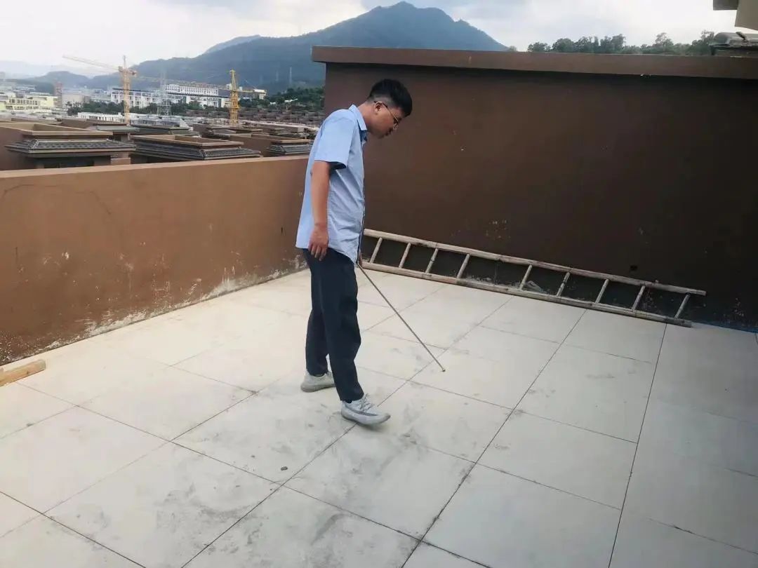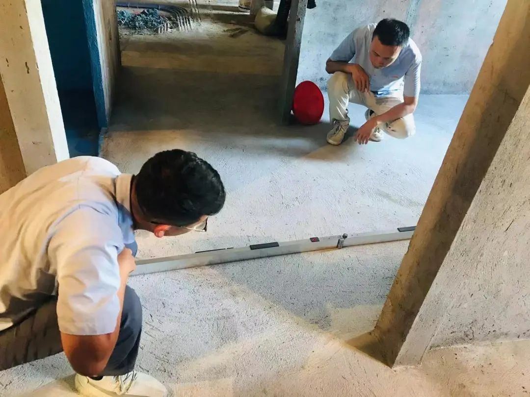 △現(xiàn)場(chǎng)用2米長(zhǎng)的靠尺檢測(cè)地面找平工作,確保每個(gè)地面平整,避免后續(xù)地板鋪設(shè)等工作留下隱患,防止出現(xiàn)空響等問題,影響工程質(zhì)量和進(jìn)度。