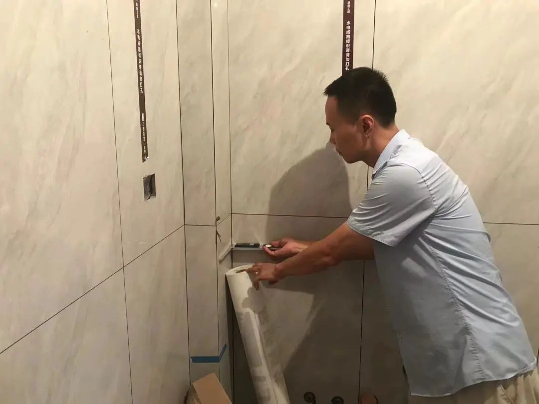 △檢查瓷磚陰角的垂直度,瓷磚陰角的垂直度關(guān)系到后續(xù)柜子和家具安裝與墻體縫隙的大小。