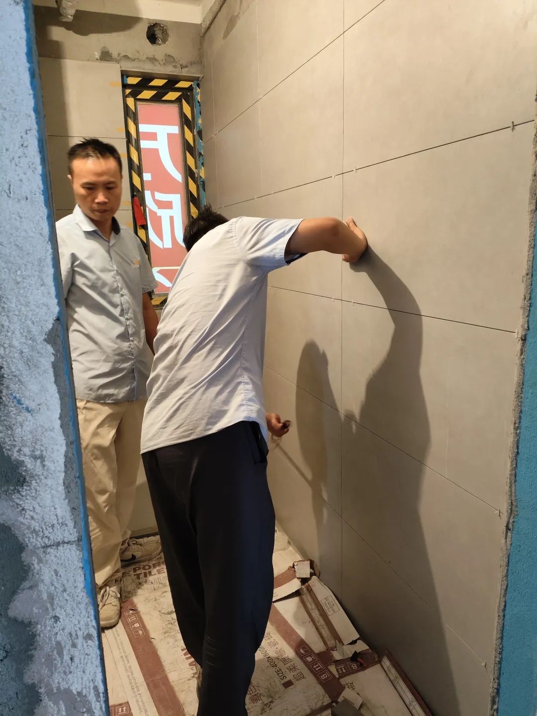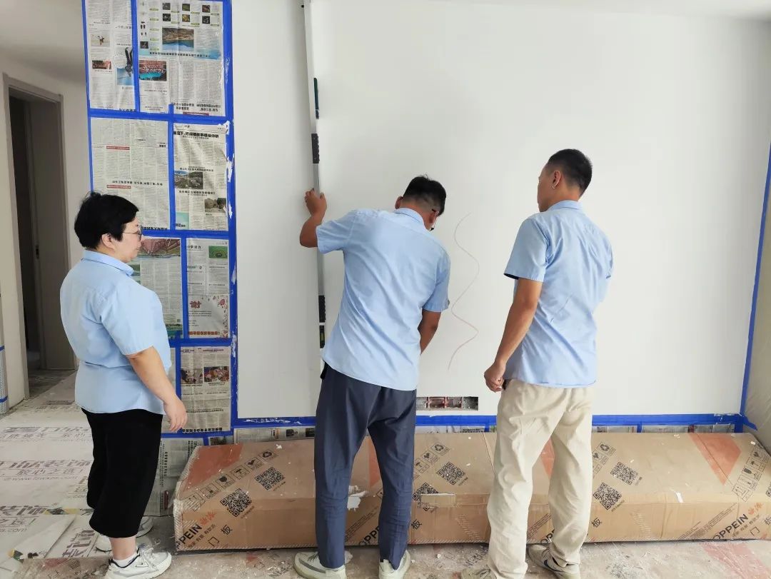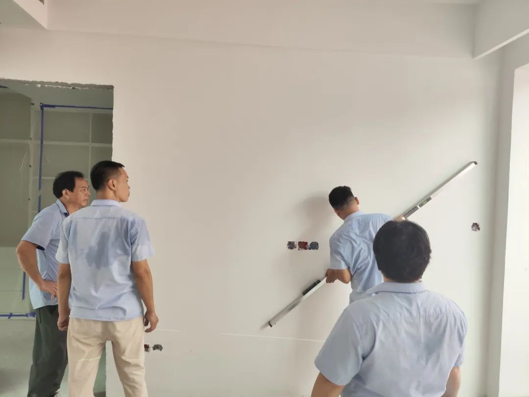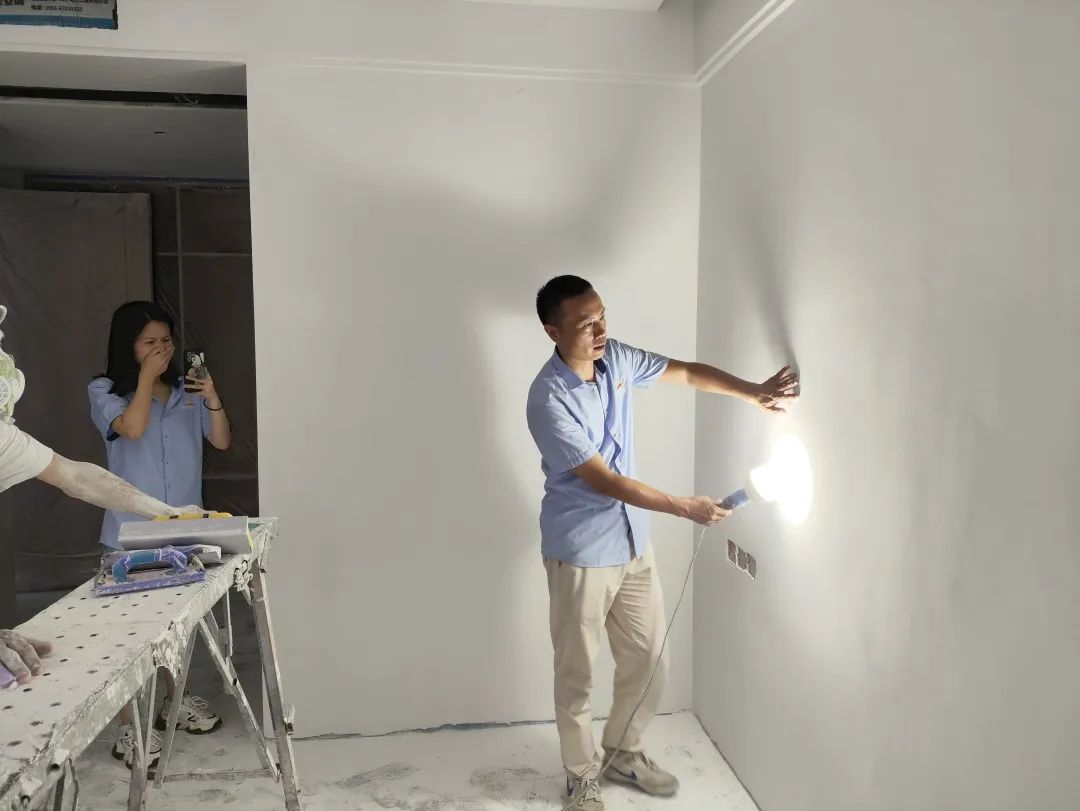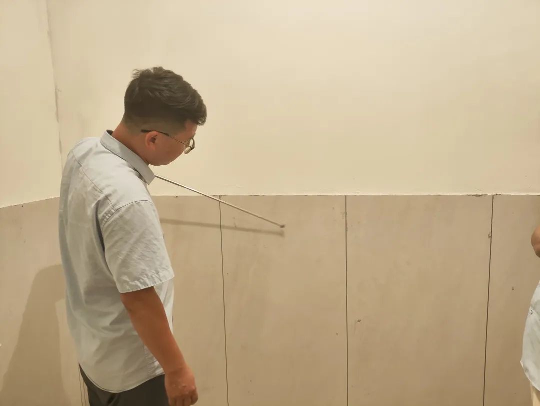 △通過手摸和眼睛觀察的方式進(jìn)行手感及墻面細(xì)節(jié)的檢查。檢查打磨后墻體的平整度,為后續(xù)噴漆施工做準(zhǔn)備。