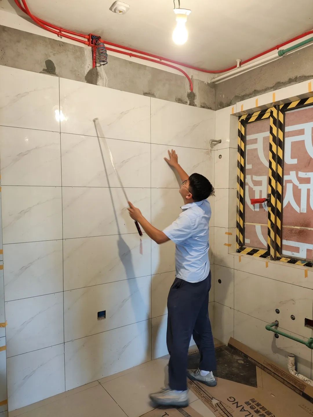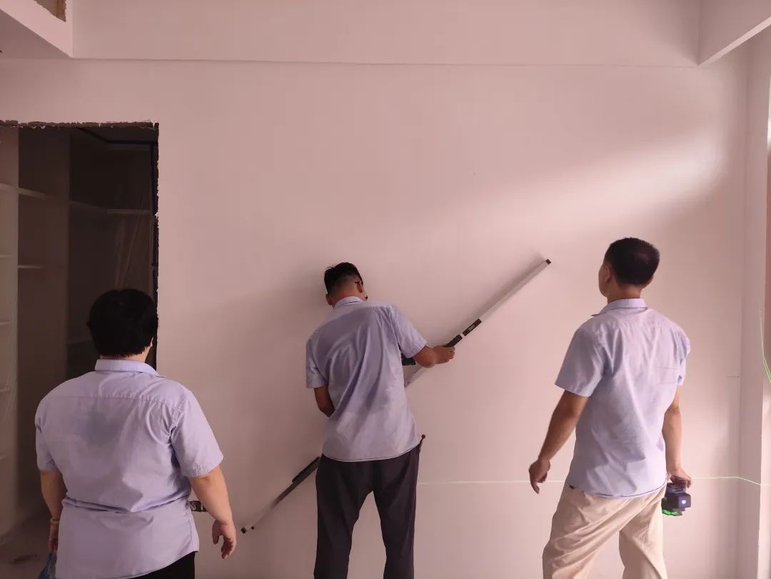 △使用2米長(zhǎng)的靠尺,檢查批灰后墻面平整是否平整,通過激光水平儀,檢查前面是否垂直。