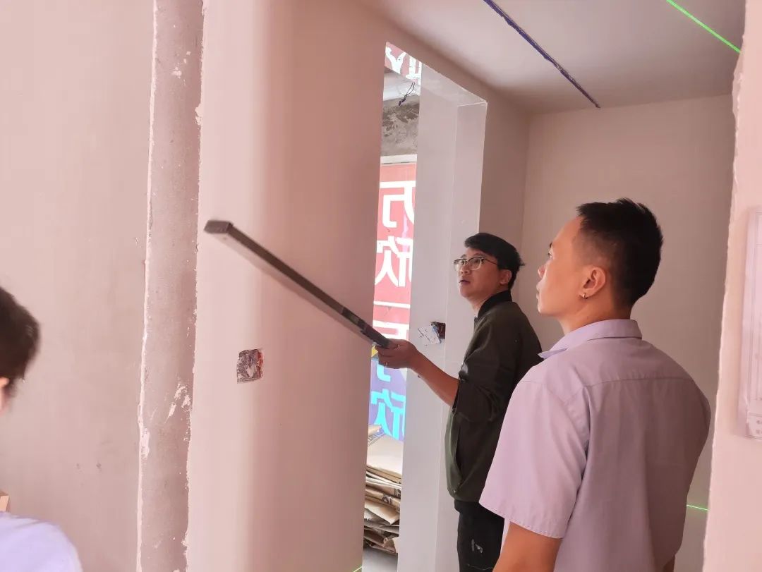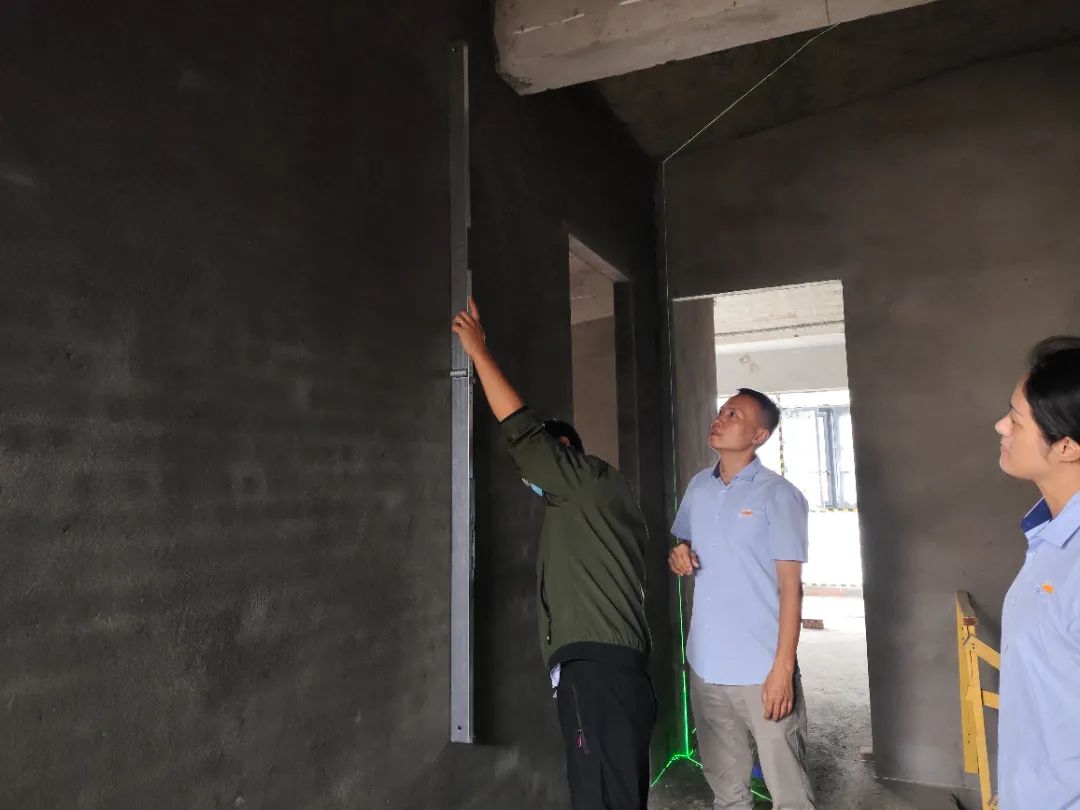 △現(xiàn)場(chǎng)用兩米靠尺和激光水平儀測(cè)量墻體的平整度和垂直度。